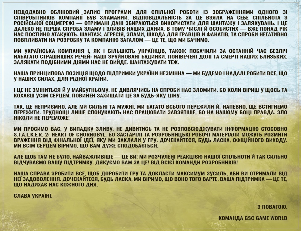"Ми просимо вас, у разі зливу, не дивитися і не поширювати інформацію, бо застарілі та розробницькі робочі матеріали можуть розмити враження від фінальної ідеї, яку ми закладали в гру. Дочекайтеся, будь ласка, офіційного виходу. Ми всім серцем віримо, що вам сподобається", - йдеться у ньому.