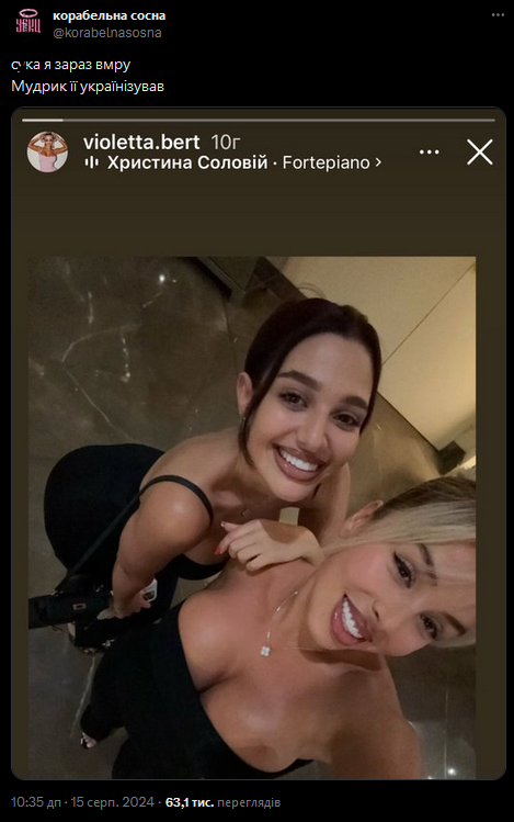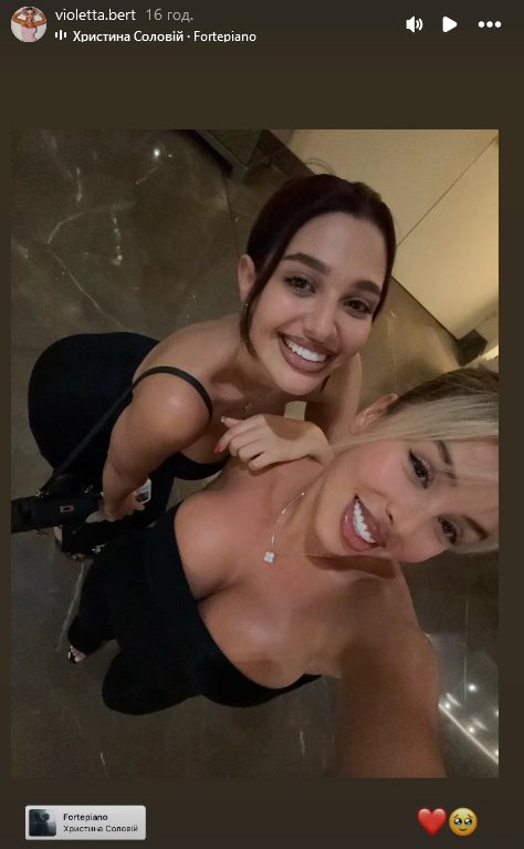 Напередодні у "сторіз" росіянка виклала фото з подругою і наклала пісню Fortepiano української виконавиці Христини Соловій. Знизу вона розмістила обкладинку треку, біля якої залишила емодзі червоного серця.