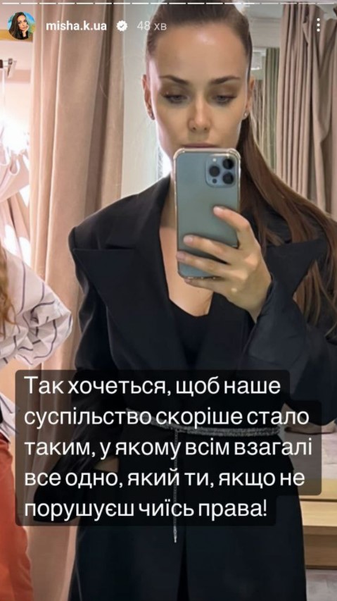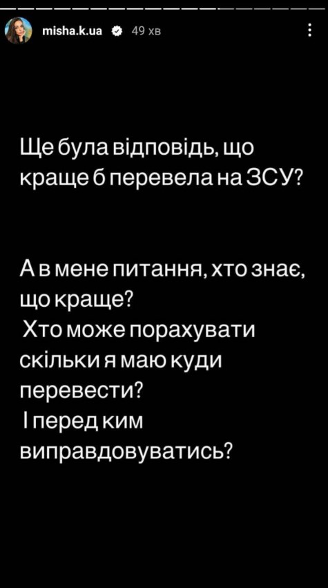 "На рахунок того, що краще б я перевела гроші на ЗСУ. А в мене питання: хто знає, що краще? Хто може порахувати, скільки я маю куди перевести? І перед ким виправдовуватись? Так хочеться, щоб наше суспільство скоріше стало таким, у якому всім взагалі все одно, який ти, якщо ти, звісно, не порушуєш чиїсь права!" - написала знаменитість.