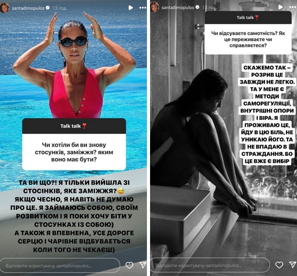 "Та ви що? Я тільки вийшла зі стосунків, яке заміжжя? Якщо чесно, я навіть не думаю про це. Я займаюся собою, своїм розвитком, я поки хочу бути у стосунках із собою. Я також впевнена, усе дороге серцю і чарівне відбудеться, коли того не чекаєш", - сказала Санта.
