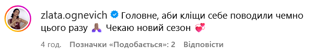 У коментарі прийшла співачка Злата Огнєвіч, яка брала участь у жіночій версії "Холостяка". Героїня шоу "Холостячка-2", зйомки якого також відбувалися у горах, попередила про кліщів.