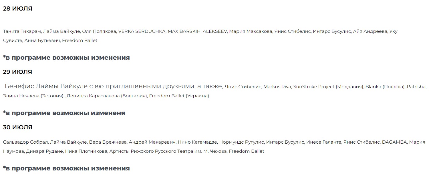 Тим не менше, в афіші можна побачити й імена інших росіян. Зокрема, там виступлять російська акторка Ніка Плотнікова та артисти Ризького Російського Театру ім. М. Чехова.
