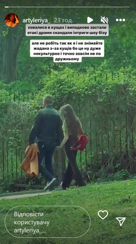 "Ховалися в кущах і випадково застали отакі драми, скандали, інтриги шоу-бізнесу. Але не робіть так як я - не знімайте Жадана з-за кущів, бо це не дуже культурно і точно зовсім не по-дружньому, - висловилася про побачене Артилерія. - Отак - поцілувалися у кліпі – і вже любов".