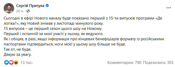 "15 випусків - це перший сезон цього шоу на Новому. Перший і останній за моєї участі у ньому, як ведучого. Як і обіцяв, у разі, якщо інформація про кінцевих бенефіціарів формату із російськими паспортами підтвердиться, ноги моєї в цьому шоу більше не буде. Так от, не буде", - написав Притула в Facebook.