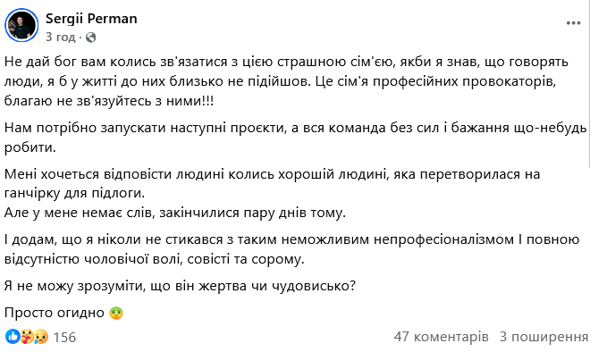 "Не дай бог вам колись зв'язатися з цією страшною сім'єю, якби я знав, що говорять люди, я б у житті до них близько не підійшов. Це сім'я професійних провокаторів, благаю не зв'язуйтесь з ними!", - написав Перман.