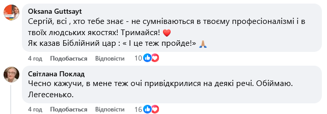 У коментарях під дописом Пермана підтримали деякі відомі представники шоубізнесу, серед яких продюсерка Олена Мозгова, телеведуча Оксана Гутцайт та вдова композитора Ігоря Поклада Світлана Поклад.