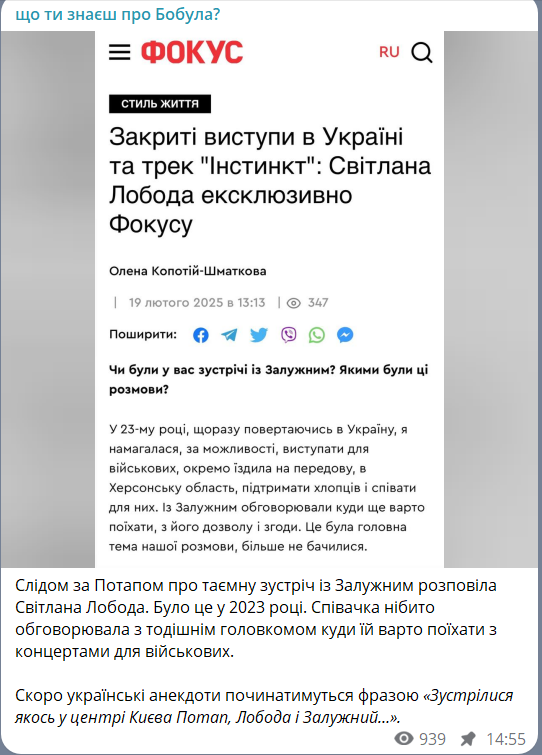 В інтерв'ю "Фокусу" співачка заявила, що це було у 2023 році, коли вона їздила з концертами на фронт. За словами Лободи, із Залужним вона обговорювала, куди ще їй варто поїхати заспівати для військових.