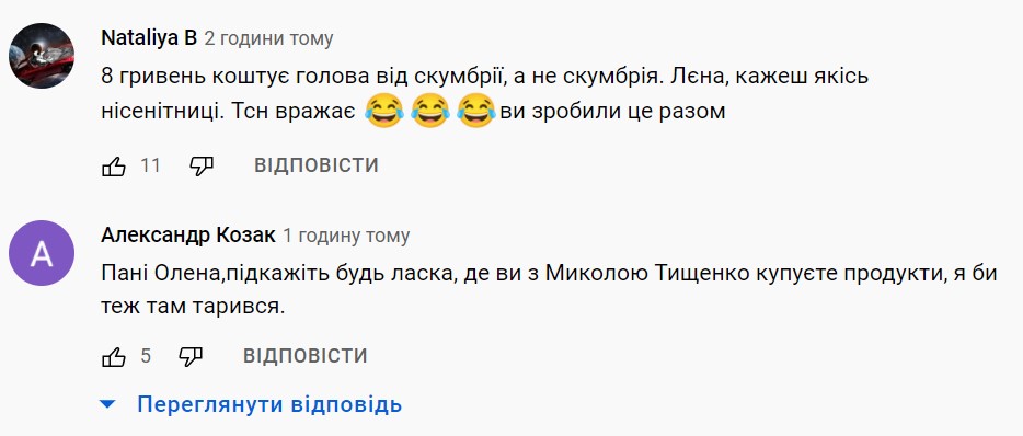 "Скумбрія по 8 та гречка по 12. Олена, на який базар ви ходите з Тищенком? Щоб народ міг так щасливо жити".