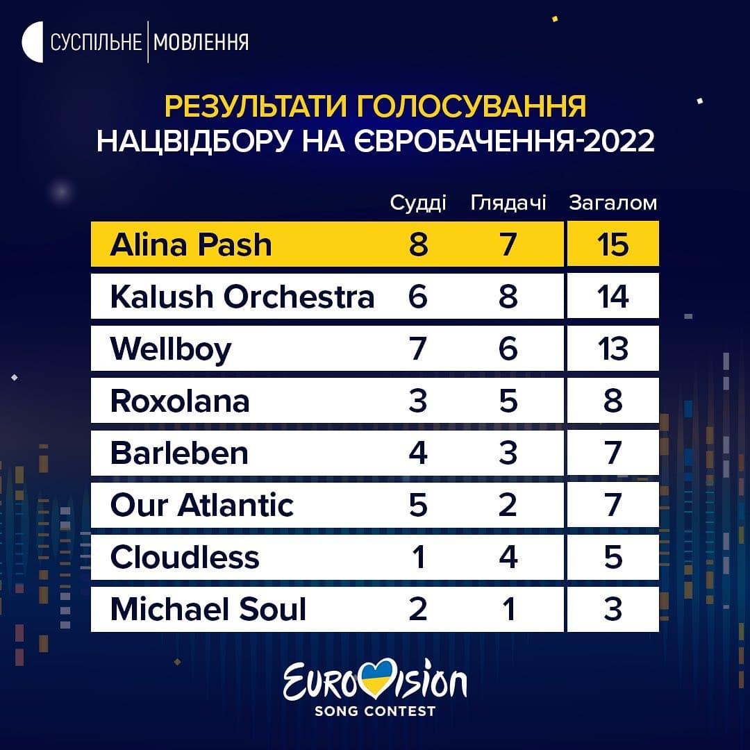 12 лютого пройшов фінал Нацвідбору на "Євробачення-2022", в якому перемогла Аліна Паш: судді конкурсу поставили їй максимальні 8 балів, а глядачі - 7. Група Kalush Orchestra взяла гору за результатами голосування глядачів, але посіла друге місце: суддя Нацвідбору та член правління Суспільного мовника Ярослав Лодигін поставив музикантам лише 3 бали, суттєво знизивши їхні шанси на перемогу. Після завершення конкурсу команда Kalush Orchestra заявила про фальшування відбору, пояснивши це помилками під час оголошення результатів.