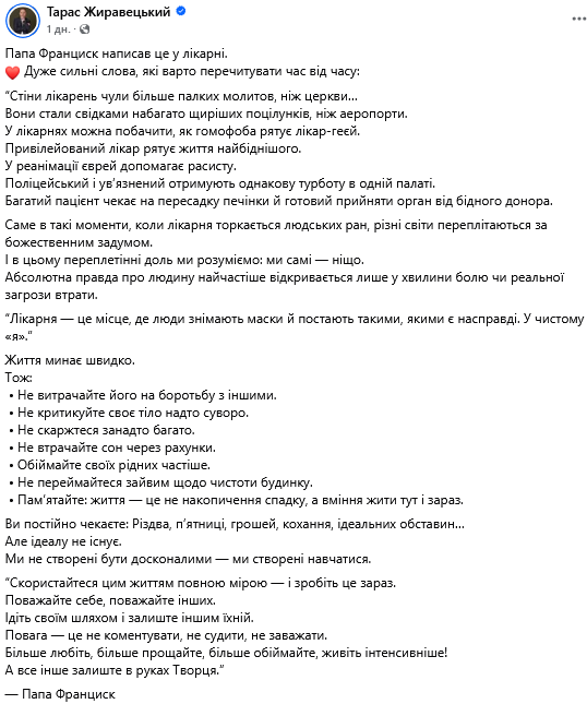 Кравець зазначила, що через сильні слова у повідомленні вирішила його зберегти й собі. Зокрема, у повідомленні йдеться про низку настанов, а починається воно так: "Стіни лікарень чули більше палких молитов, ніж церкви… Вони стали свідками набагато щиріших поцілунків, ніж аеропорти. У лікарнях можна побачити, як гомофоба рятує лікар-гей. Привілейований лікар рятує життя найбіднішого. У реанімації єврей допомагає расисту. Поліцейський і ув"язнений отримують однакову турботу в одній палаті. Багатий пацієнт чекає на пересадку печінки й готовий прийняти орган від бідного донора...".