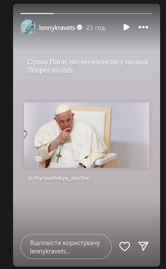 Українська актриса Олена Кравець в історіях на своїй сторінці в Instagram прокоментувала посилання, де лікар Тарас Жиравецький опублікував нібито слова Папи Римського Франциска.
