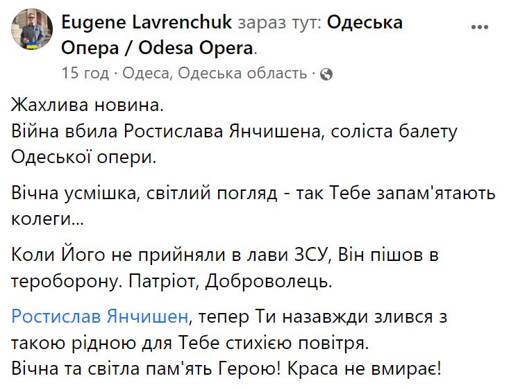 На війні загинув соліст балету Одеського національного академічного театру опери й балету Ростислав Янчишен. Він пішов захищати Україну добровольцем та був кулеметником.
