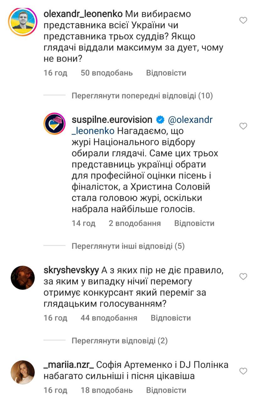 "Знову розчарування в українських відборах", - пишуть глядачі. - "Дует був найкращим!" "Не згодна з голосуванням суддів. Чому у дорослому відборі у разі збігу балів перемогу отримує той, хто має більше балів від глядачів, а у дитячому не так?" "Дует виділився б на тлі будь-кого, шкода". "З якого часу не діє правило, згідно з яким у разі нічиєї перемогу отримує конкурсант, який переміг у глядацькому голосуванні?"