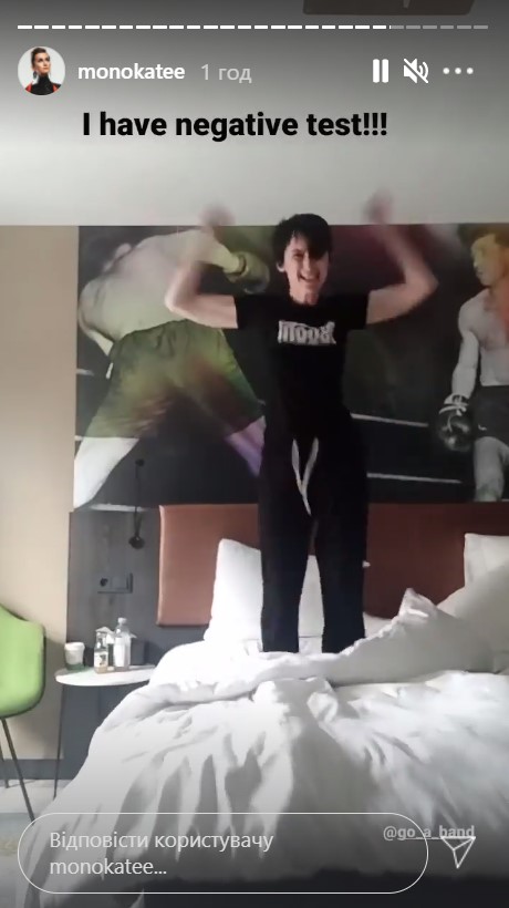 Про отримання негативного тесту Павленко повідомила в "сторіз" на особистій сторінці в Instagram, а також на офіційній сторінці гурту. Дівчина записала коротке відео, на якому не стримує радості і стрибає на ліжку під конкурсну пісню Go_A.