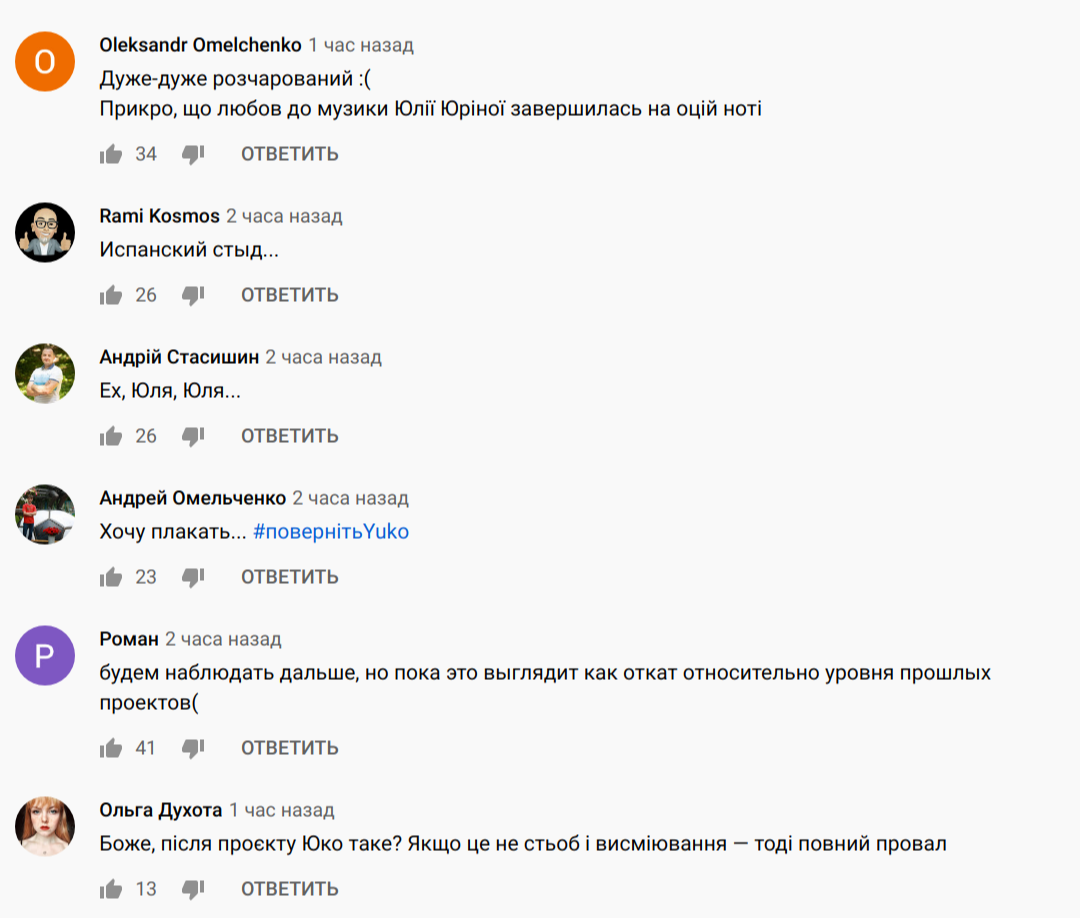 "Іспанський сором. Калька на російську попсу, яка сама є калькою. Чисто лайк в ТікТок від пубертатних прищів. Це не про творчість, а про хайп", - пишуть в коментарях. - "Будемо спостерігати далі, але поки це виглядає як відкат щодо рівня минулих проектів". "Після проекту Юко - таке? Якщо це не стьоб і не висміювання, тоді повний провал".