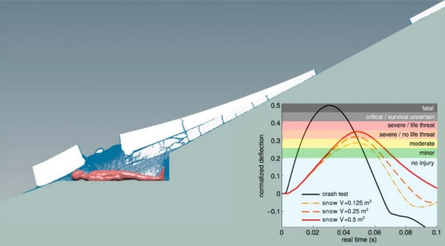 Тривимірне моделювання показало, що навіть мала кількість снігу могла стати причиною серйозних, нехай і несмертельних травм. Що ж стосується масивної сніжної брили, вона дійсно здатна нанести людині травми у вигляді перелому ребер, грудної клітини або черепа.