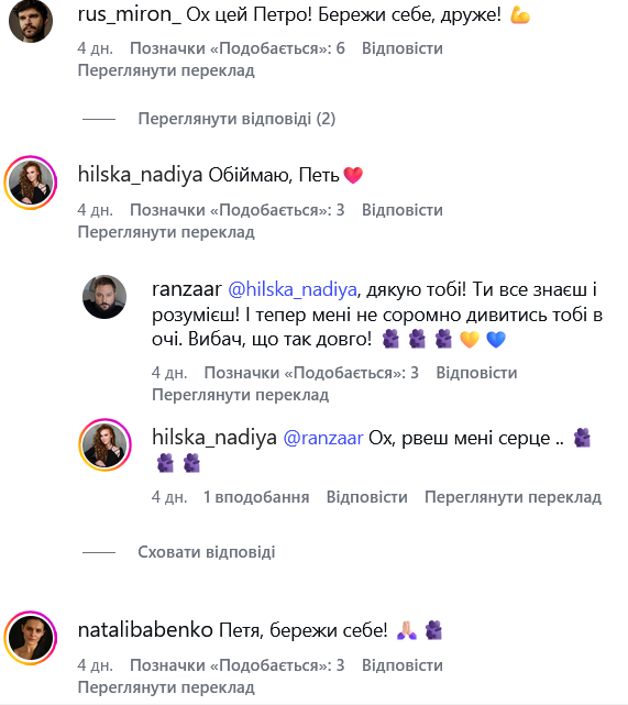 У коментарях Крилова підтримали чимало його колег, зокрема акторка Надія Хільська, яка у серпні 2023 року втратила на війни чоловіка, актора Олексія Хільського.