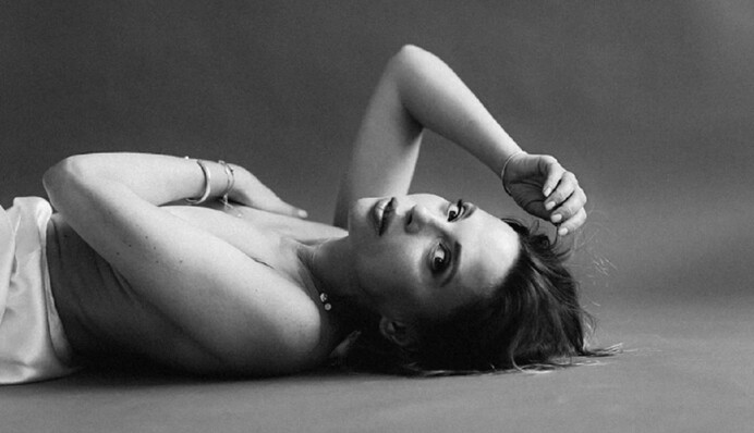 Знаменитість оприлюднила студійні кадри, на яких вона позує на підлозі, прикривши груди руками.