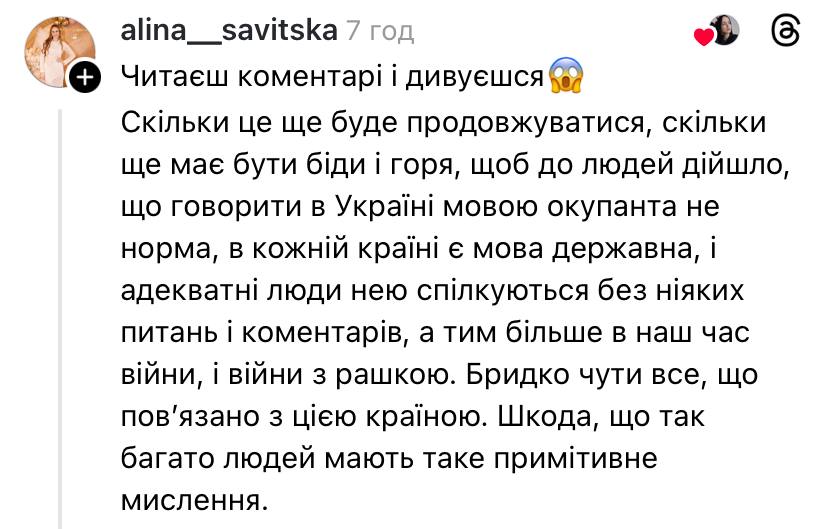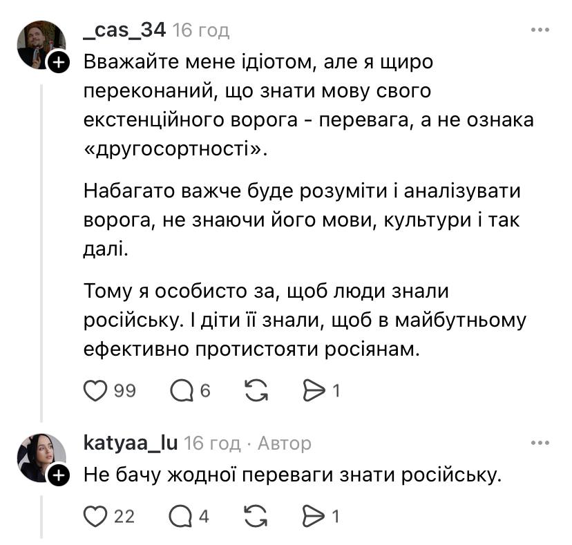 Дехто в коментарях зазначив, що володіти російською - це володіти інструментом переваги над ворогом, який не розуміє української. Адже на початку повномасштабного вторгнення українці ідентифікували росіян саме за вмінням вимовляти відмінні від російської слова українською. Блогерка відповіла, що не бачить в цьому переваги.