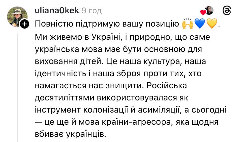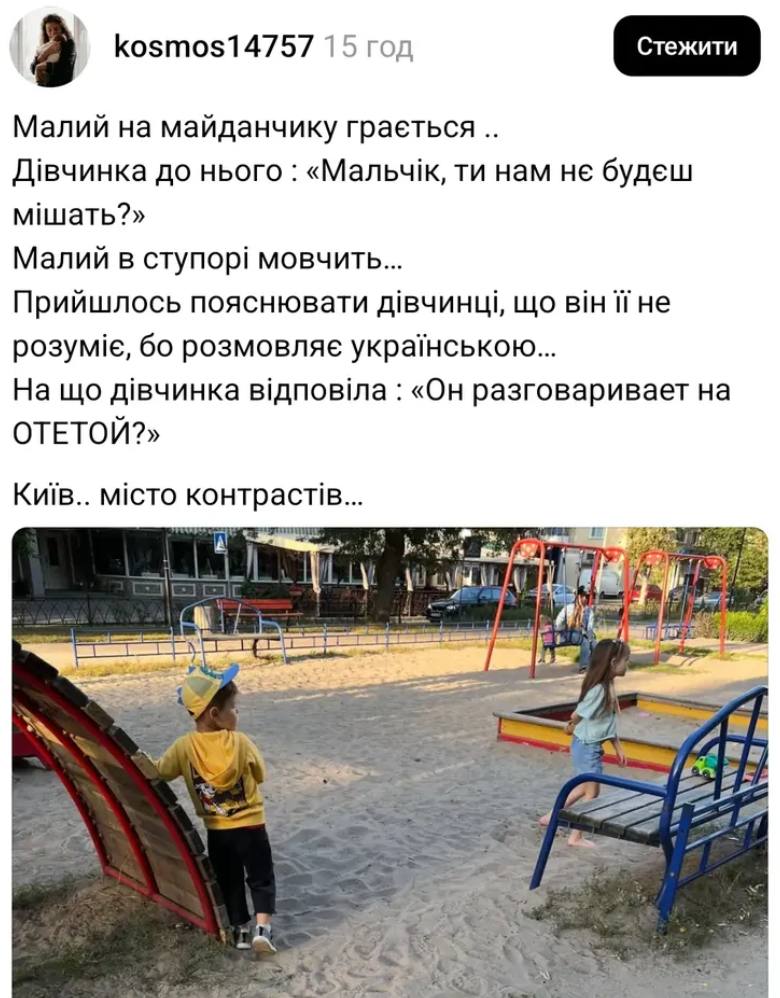"Мої діти ніколи не будуть знати росіянського. Знають досконало українську,вивчають англійську. А російськомовних дітей сприймають,як ворогів. Вони не хочуть з ними дружити, комунікувати. Їх лякає язик терористів. Розділяю їхню думку. Щиро не розумію, для якого суспільства батьки вирощують таких. Свідомо роблячи своїх дітей - другосортними. Ну ок.Ваш вибір.Вигрібайте тоді", - описала блогерка Катерина.