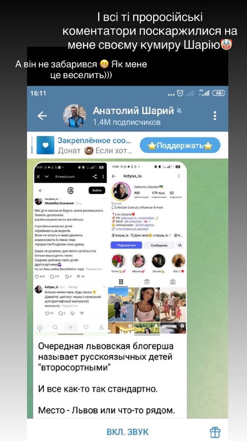В Instagram блогерка поділилась, що "проросійські коментатори поскаржилися на мене своєму кумиру Шарію", який відомий проросійською позицією та звинувачується СБУ у держзраді.