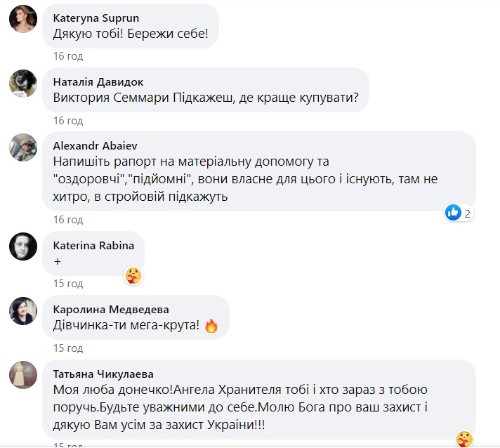 У коментарі до публікації знайомі, друзі, колеги та прості українці висловлюють своє захоплення вчинком молодої та тендітної дівчини, дають поради, до яких фондів звернутися, а також бажають удачі.
