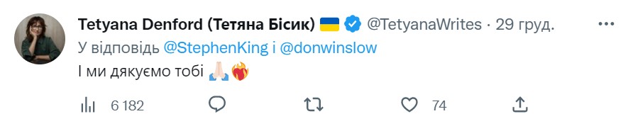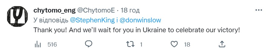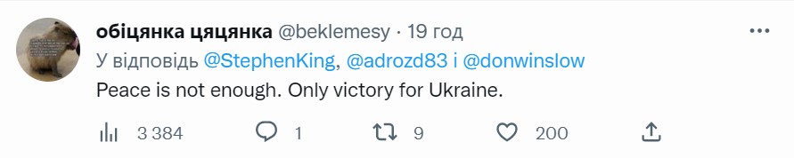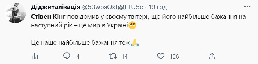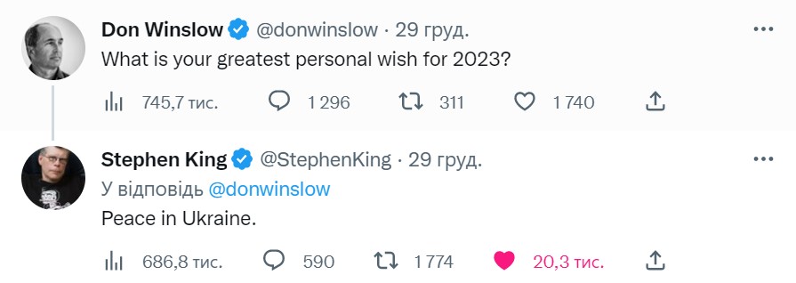У Twitter письменник відповів на запитання свого колеги Дона Вілсона: "Яке ваше найбільше особисте бажання на 2023 рік?" "Мир в Україні", - написав Стівен Кінг.