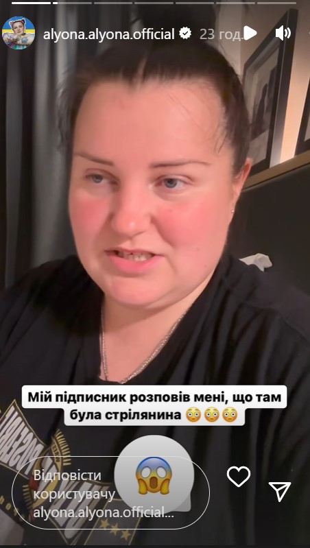 "На передостанній пісні, 5 частина людей, десь далеко в кінці, де вони стояли, почала кудись бігти. Я подумала, можливо, артист на іншій сцені виступає і вони побігли на свого улюбленого виконавця, бігли не швидко. Мені написав мій підписник, про те, що вони з сестрою йшли на мій концерт, почули стрілянину, почав бігти народ і вони зупинились і сховались за рогом, коли прийшли, концерт вже закінчився", – сказала alyona alyona у своєму блозі.