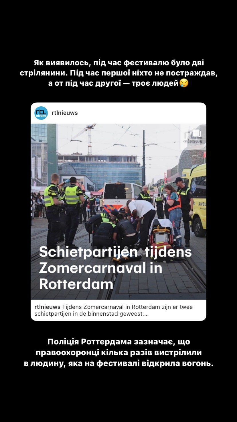 Також реперка уточнила, що час першої стрілянини ніхто не постраждав, а протягом другої поранили трьох людей. Поліція Роттердама стріляла у відповідь. Що саме стало причиною стрілянини на масштабному заході у Роттердамі, наразі залишається невідомим.