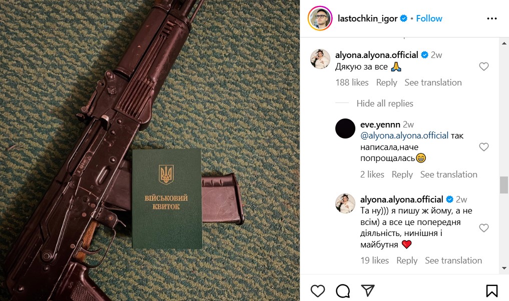 Співачці Alyona Alyona дорікнули за "неправильну" подяку гумористу, актор та тренеру "Ліги Сміху" Ігорю Ласточкіну, який пішов служити у Збройних силах України.