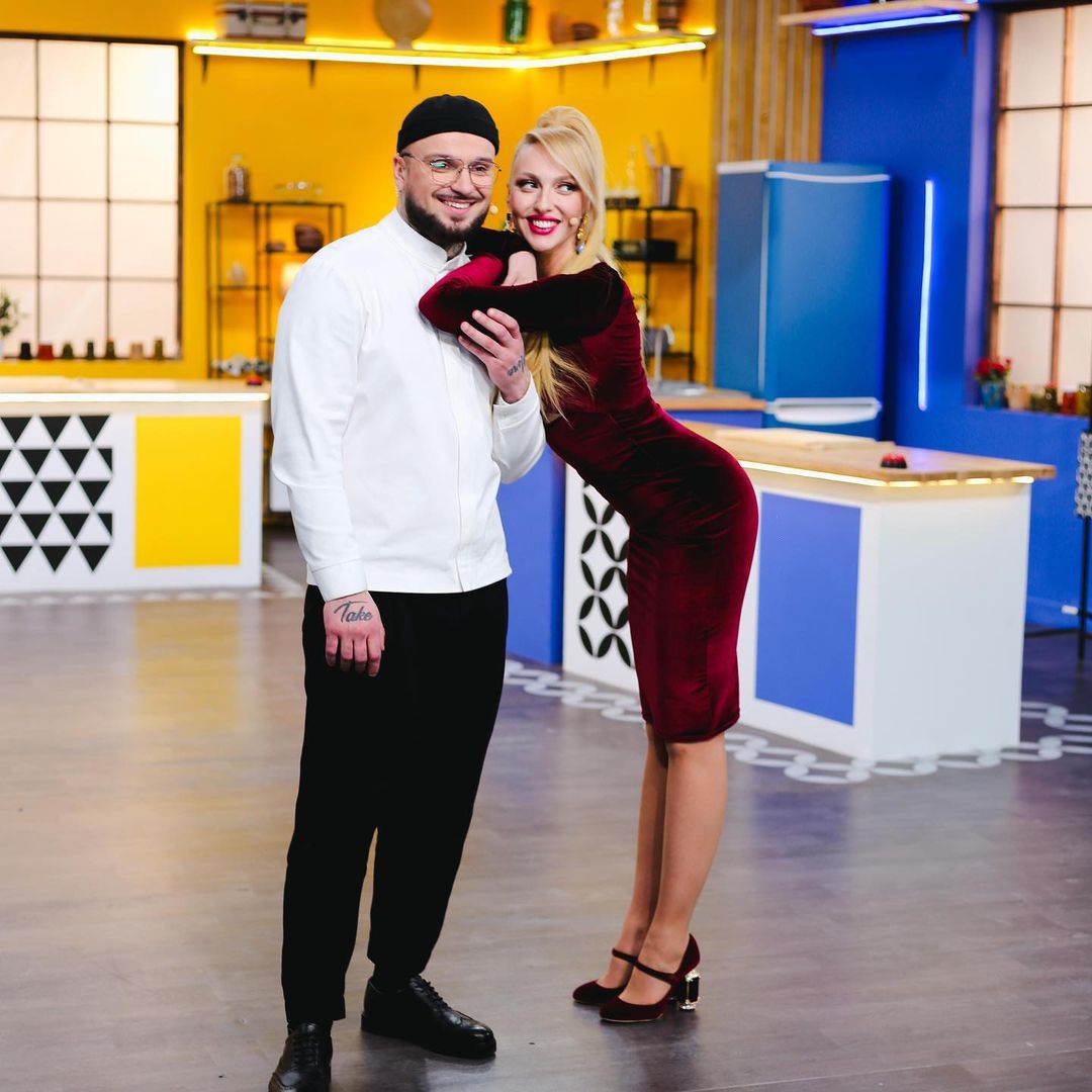 Оля Полякова і Влад Міцкевич на зйомках шоу "Він готує, вона керує"