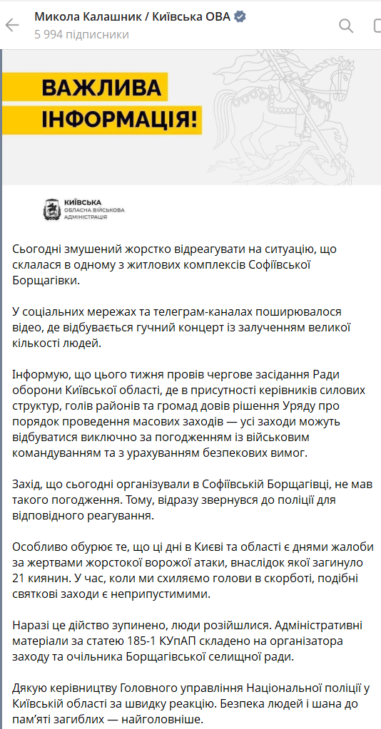 Голова Київської ОВА Микола Калашник у своєму Telegram наголосив, що гучний концерт із залученням великої кількості людей, що відбувся в трагічний день, не мав погодження з військовим командуванням. Через це він звернувся до поліції, після чого захід зупинили.