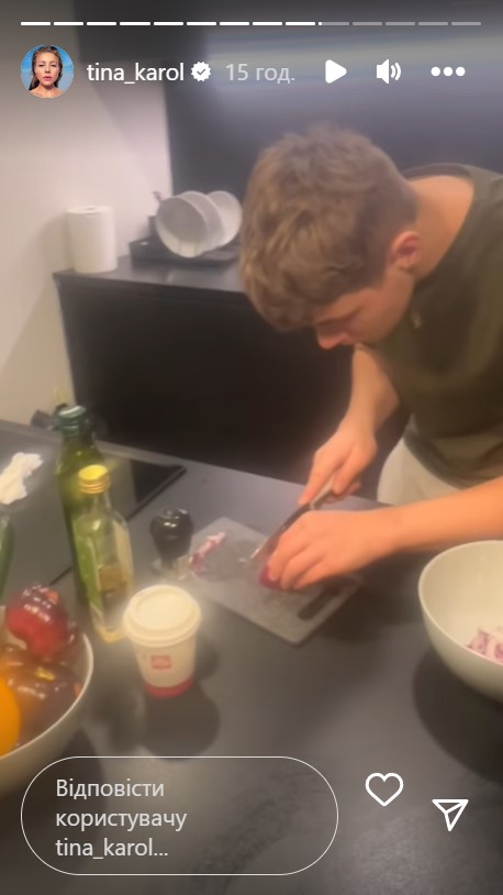 У своєму блозі в Instagram виконавиця опублікувала кілька stories, на яких показала, як син-підліток допомагає їй готувати. Родина зробила запечену у духовці курку та салат.