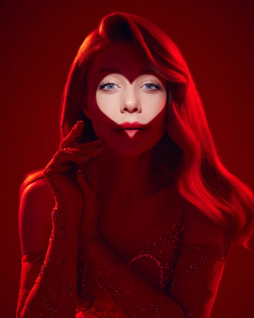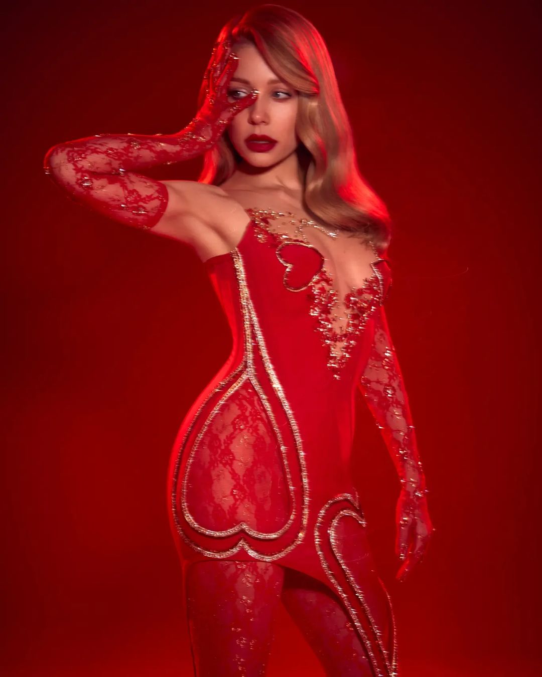 Вбранням Тіни Кароль стала коротка червона сукня з глибоким декольте і вирізами у вигляді сердець. Образ у стилі кабаре доповнили напівпрозорі мереживні панчохи та високі рукавички, декоровані золотими блискітками.