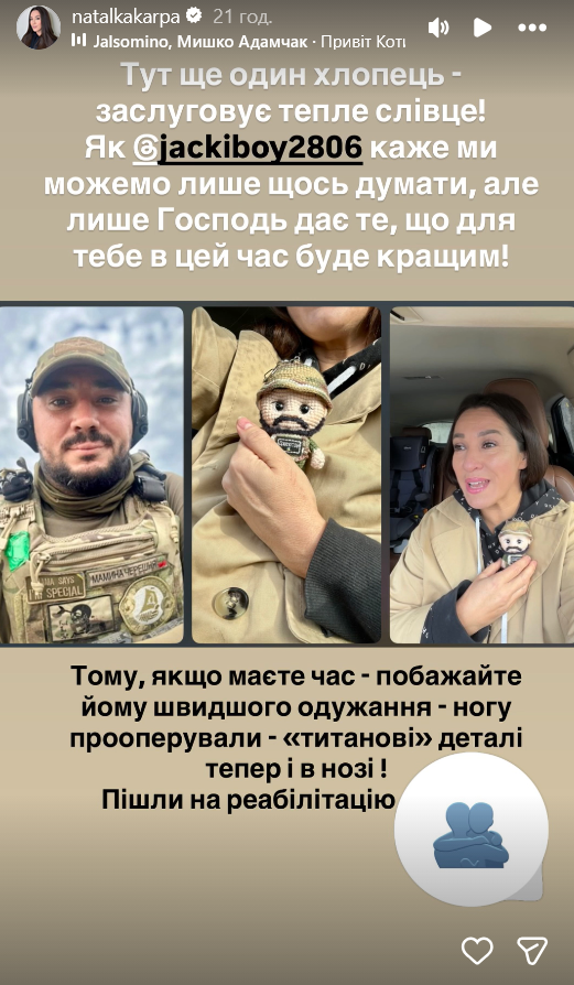 "Тут ще один хлопець заслуговує тепле слівце. Як Євген каже, ми можемо лише щось думати, але лише Господь дає те, що для тебе в цей час буде кращим. Тому, якщо маєте час - побажайте йому швидшого одужання - ногу прооперували - "титанові" деталі тепер і в нозі. Пішли на реабілітацію", - написала вона.