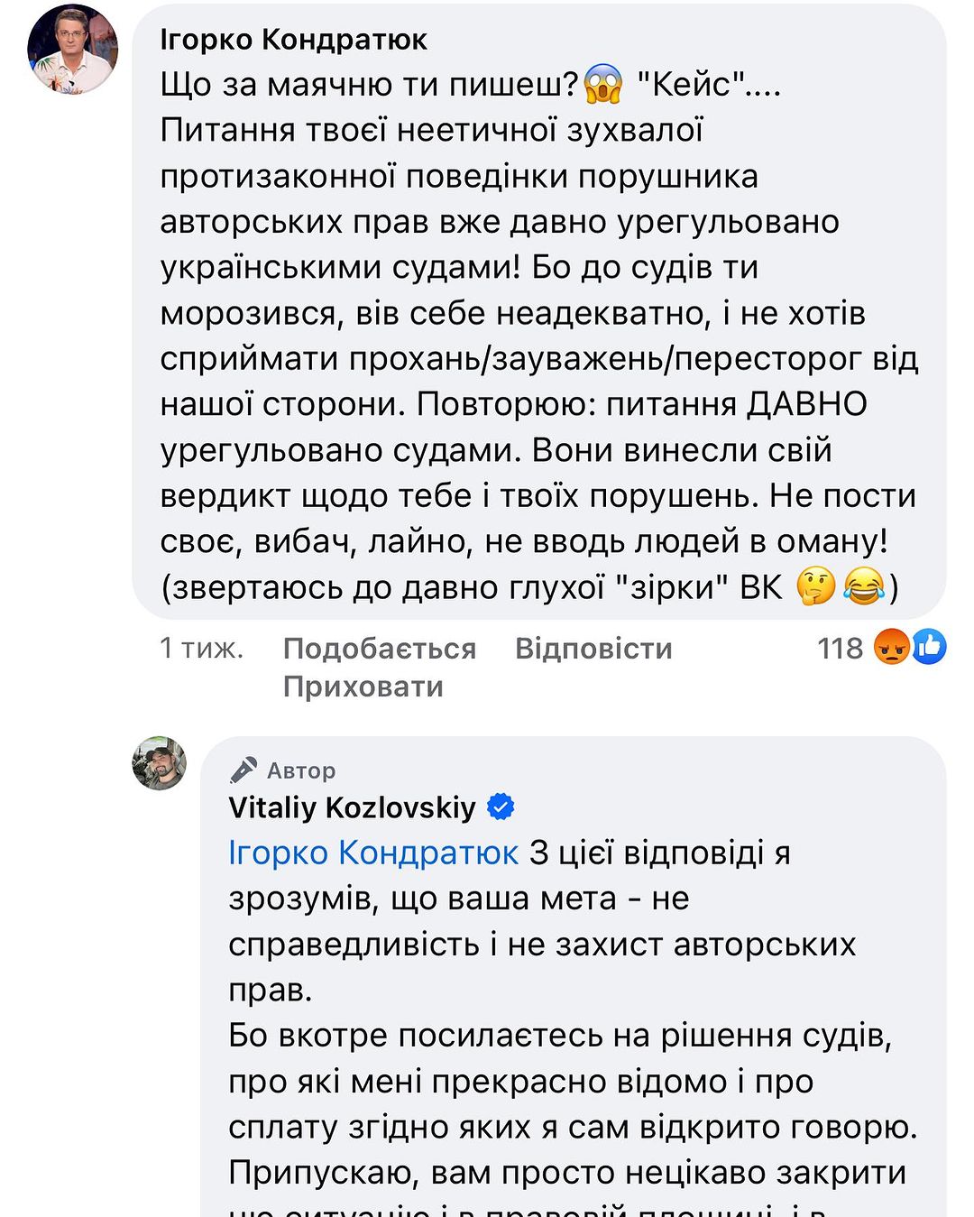 "Питання твоєї неетичної, зухвалої, протизаконної поведінки порушника авторських прав давно врегульоване українськими судами! Бо до судів ти морозився, поводився неадекватно, і не хотів сприймати прохання, зауваження, застереження з нашого боку. Повторюю: питання ДАВНО врегульовані судами. Вони винесли вердикт щодо тебе і твоїх порушень. Не пость своє, вибач, лайно, не вводь людей в оману", - прокоментував продюсер пропозицію колишнього підопічного.