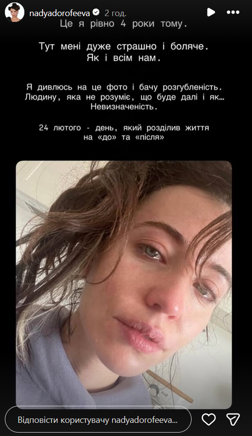 "Це я рівно 4 роки тому. Тут мені дуже страшно і боляче. Як і всім нам. Я дивлюсь на це фото і бачу розгубленість. Людину, яка не розуміє, що буде далі і як... 24 лютого - день, який розділив життя на "до" та "після"", - зазначила співачка.