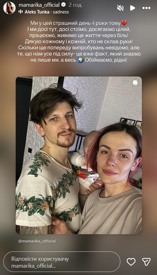 "Ми у цей страшний день 4 роки тому. І ми досі тут, досі стоїмо, досягаємо цілей, працюємо, живемо це життя через біль! Дякую кожному і кожній, хто не склав руки! Скільки ще попереду випробувань невідомо, але те, що нам усе під силу - це вже факт, який знаємо не лише ми, а весь світ", - написала співачка під фото зі своєю сім'єю.