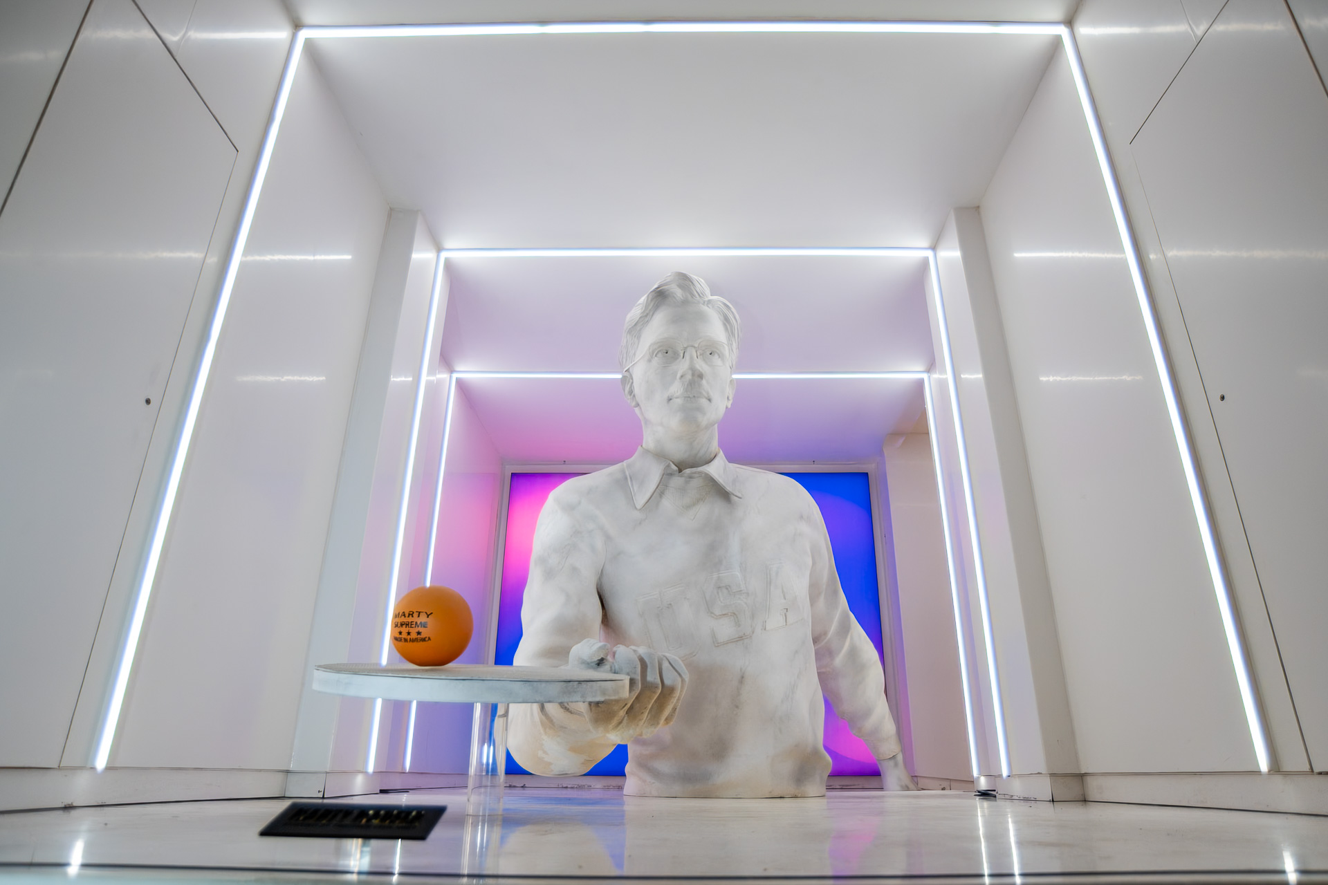 Скульптура зображує Шаламе в образі Марті Маузера – вигаданого персонажа, створеного за мотивами реальної постаті американського чемпіона з настільного тенісу Марті Райсмана.