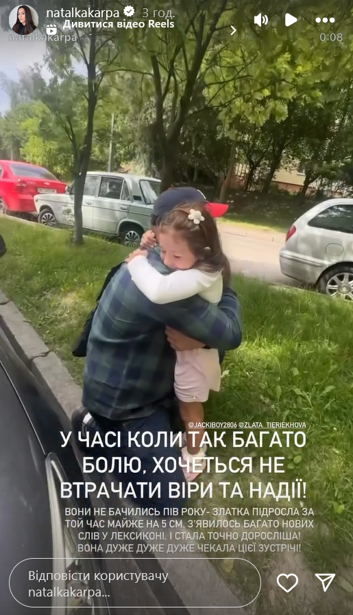 "Вони не бачились пів року - Златка підросла за той час майже на 5 см, з'явилось багато нових слів у лексиконі, і стала доросліша. Вона дуже-дуже-дуже чекала цієї зустрічі", - поділилася зіркова мама, показавши кадри теплих та міцних обіймів.
