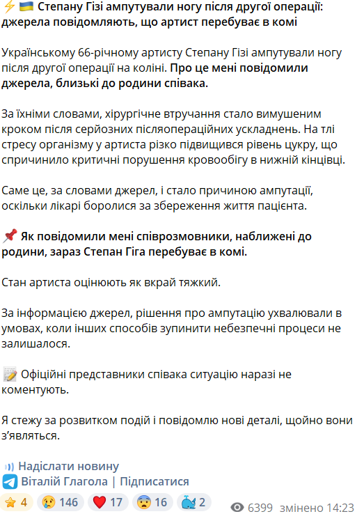 "Українському 66-річному артисту Степану Гізі ампутували ногу після другої операції на коліні. Про це мені повідомили джерела, близькі до родини співака. За їхніми словами, хірургічне втручання стало вимушеним кроком після серйозних післяопераційних ускладнень. На тлі стресу організму у артиста різко підвищився рівень цукру, що спричинило критичні порушення кровообігу в нижній кінцівці. Саме це, за словами джерел, і стало причиною ампутації, оскільки лікарі боролися за збереження життя пацієнта. Як повідомили мені співрозмовники, наближені до родини, зараз Степан Гіга перебуває в комі. Стан артиста оцінюють як вкрай тяжкий".