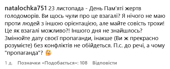 "Ви знаєте, що 23 листопада День Пам'яті жертв голодомору? Чи вам наплювати на українську кров, яка досі не окупилася?";