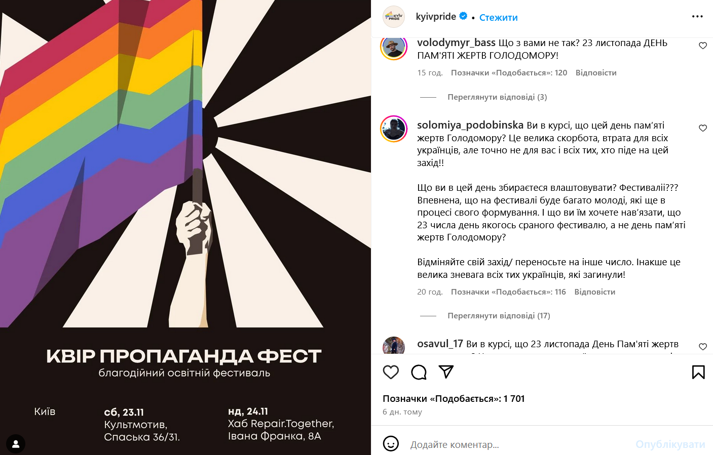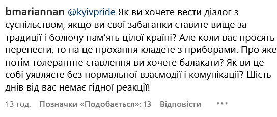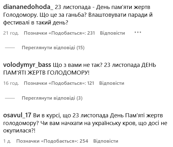 Закликають змінити дату фестивалю і користувачі соцмережі. На сторінці Kyiv Pride українці висловлюють обурення і незгоду з рішенням провести захід у скорботний день. Ось деякі коментарі: