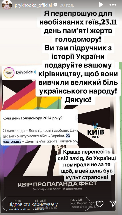 "Я перепрошую, для необізнаних геїв, 23.11 - День пам'яті жертв Голодомору! Ви там підручник з історії України подаруйте вашому керівництву, щоб вони вивчили великий біль українського народу! Дякую!", - відреагувала Приходько.