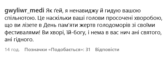 "Ви в курсі, що цей день пам"яті жертв Голодомору? Це велика скорбота, втрата для всіх українців, але точно не для вас і всіх тих, хто піде на цей захід! Що ви в цей день збираєтеся влаштовувати? Фестивалі??? Впевнена, що на фестивалі буде багато молоді, які ще в процесі свого формування. І що ви їм хочете нав"язати, що 23 числа день якогось сраного фестивалю, а не день пам"яті жертв Голодомору? Відміняйте свій захід/ переносьте на інше число. Інакше це велика зневага всіх тих українців, які загинули!";