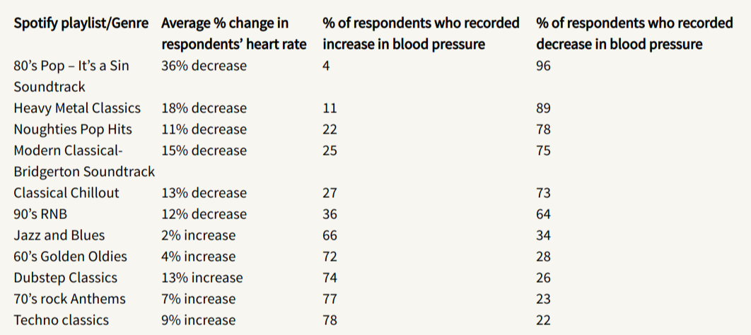 В ході експерименту 1540 дорослих (18-65 років) пройшли серію психологічних стрес-тестів, паралельно слухаючи різні плейлисти на Spotify, включаючи музику 60-х років, рок-гімни 70-х, дискотеку 80-х і популярні пісні 90-х. У дослідження також включили менш популярні стилі, такі як хеві-метал, дабстеп, джаз і сучасну класику. Учасникам вимірювали пульс і артеріальний тиск, і хіти 80-х справили на них найбільш заспокійливу дію: 96% добровольців повідомили про зниження тиску, а у 36% нормалізувався серцевий ритм.