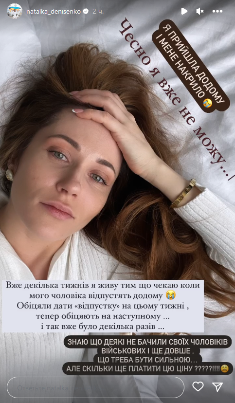 "Вже декілька тижнів я живу тим, що чекаю, коли мого чоловіка відпустять додому. Обіцяли дати "відпустку" на цьому тижні, тепер обіцяють на наступному... і так вже було кілька разів", - сказала Наталка. - Знаю, що деякі не бачили своїх чоловіків-військових ще довше... Знаю, що треба бути сильною, але скільки ще платити цю ціну?".