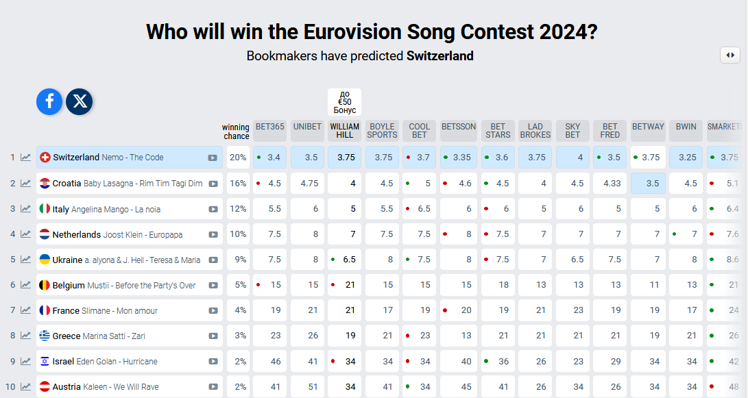 Фаворитом букмекерських ставок, як і раніше, залишається співак Nemo зі Швейцарії, який несподівано вирвався вперед і змістив попереднього лідера Baby Lasagna з Хорватії. Замикає трійку лідерів італійська співачка Анджеліна Манго – перша жінка, яка представить Італію на "Євробаченні" за останні 8 років.