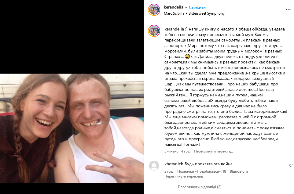 "Я пишаюся нами, нашим шляхом, нашим сином, нашою любов'ю! Я завжди любитиму тебе і наші десять років. Ми одружилися одразу, і нам не було перешкод, незважаючи на те, що вони були. Наша історія велика! Ми ще багатьом допоможемо, розповівши про неї. Я з величезною вдячністю та легким серцем кажу, що ми з тобою назавжди рідні, і сміятися та розуміти з напівпогляду будемо вічно. Як чоловік з жінкою на нас чекають різні шляхи, і це і чудово! Люблю нас, відпускаю! Вперед та назавжди! Погнали!", - написала росіянка у своєму блозі.
