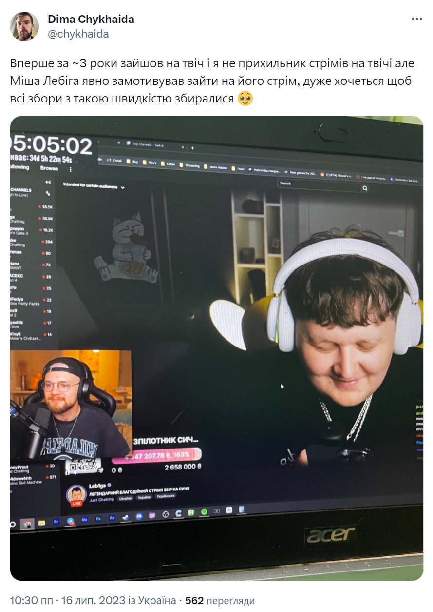 16 липня український стример Михайло Лебіга (Leb1ga) влаштував на платформі Twitch (Твіч) збір коштів на розвідувальний безпілотник "Сич" для ГУР МОУ. За час стриму, який тривав з 21:00 до 4 ранку, йому вдалося зібрати рекордні 8 млн. грн. Цієї суми має вистачити на три літальні апарати.